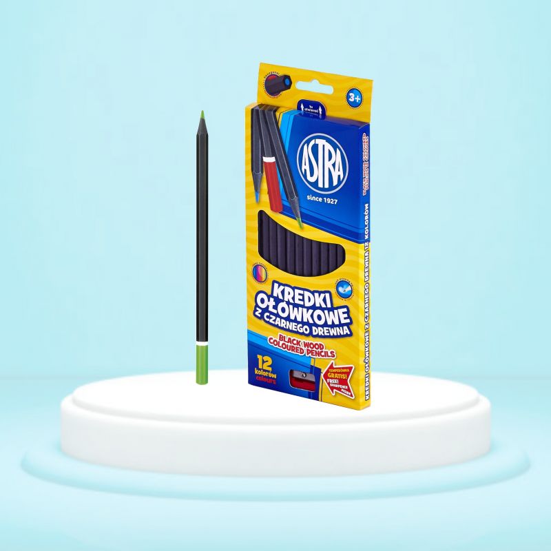 Creioane colorate, 12 buc/set, lemn negru, plus ascutitoare