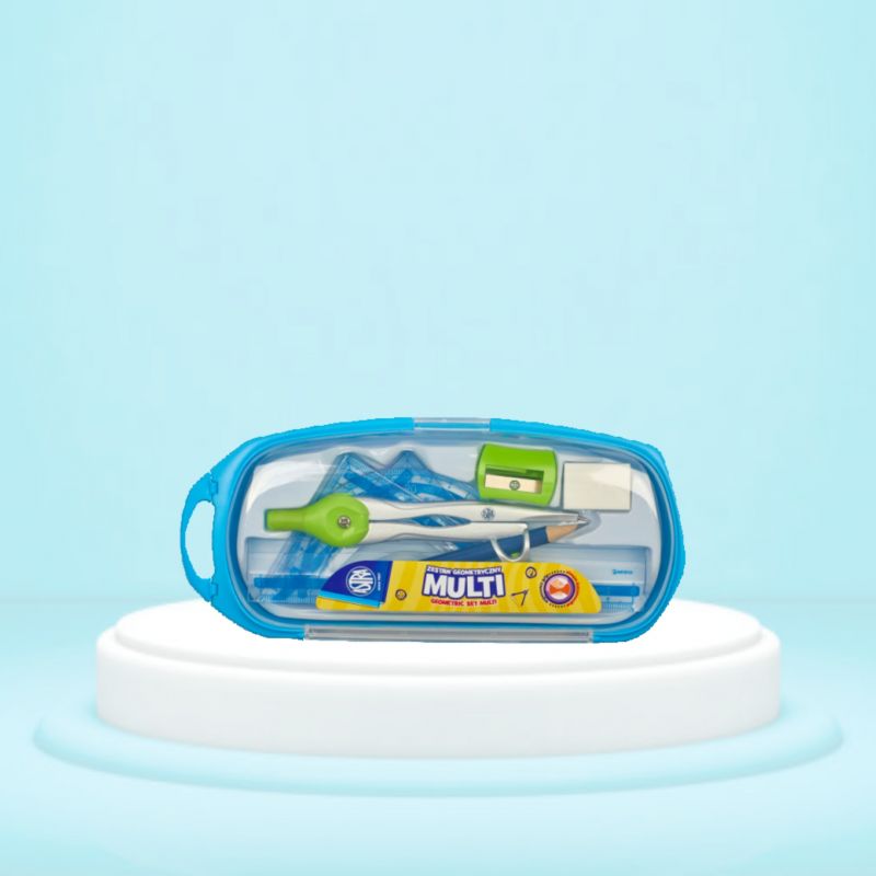 Trusa geometrie cu 8 piese, rigla 15cm, echer 45grade, echer 60grade, raportor 180grade, compas metalic, guma sters, ascutitoare si creion, ASTRA